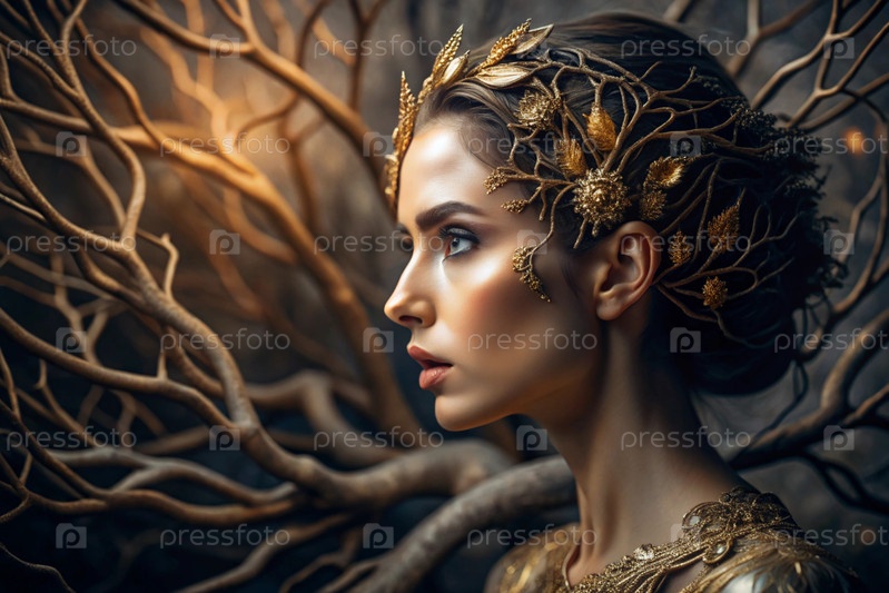 Творческий баннер для салона красоты в черно-золотом цвете. Красивая женщина, окруженная лесом с макияжем и волосами. Золотые ветви дерева в волосах. Индустрия красоты