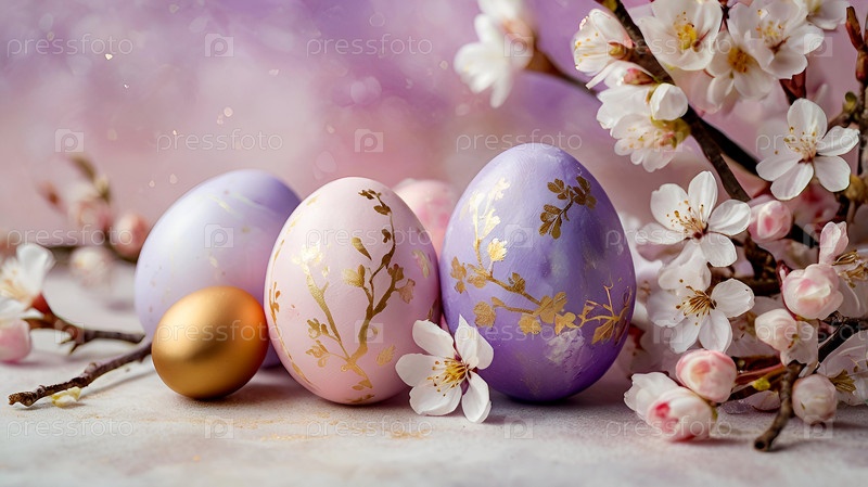 Нежные пасхальные яйца и вишневые ветви цветут на пастельном акварельном фоне с нежными полосками