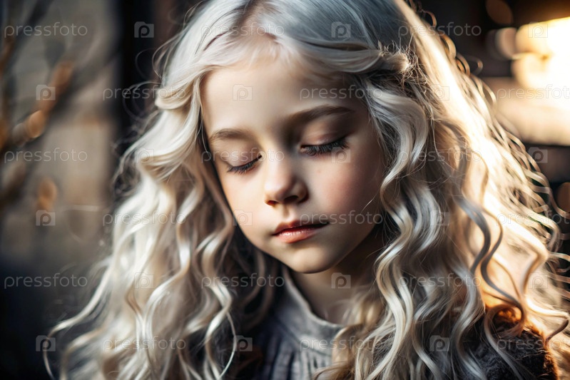 Портрет красивой маленькой блондинки с длинными волнистыми волосами и вдумчивым взглядом.Волосы развиваются и создают ощущение легкости и естественности