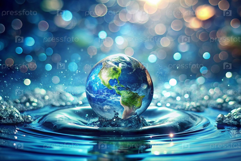 Концепция праздника - Всемирный день воды и День Земли.Планета Земля находится в чистой воде с капельками и брызгами.Красивый боке