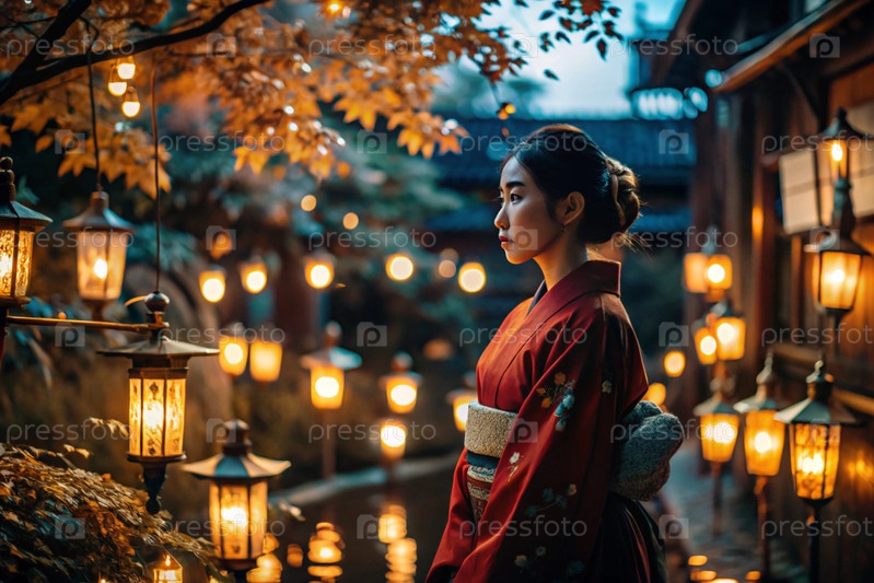 Японская девушка в традиционном национальном костюме - кимоно. На сказочном фоне фонарики и осенние деревья. Портрет символизирует традиции и культуру народа Японии