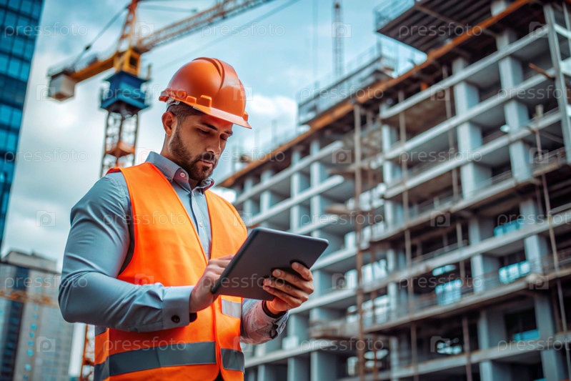 Строитель, главный мастер шлема и защитного жилета с планшетом в руке на строительной площадке, демонстрирующий внедрение технологий в строительство