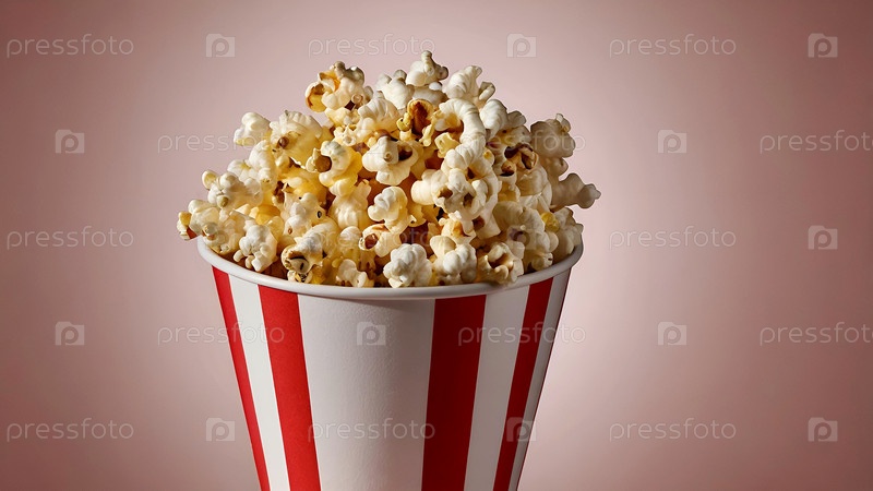Красно-белый полосатый ящик с солеными попкорнами.Популярная закуска в кино