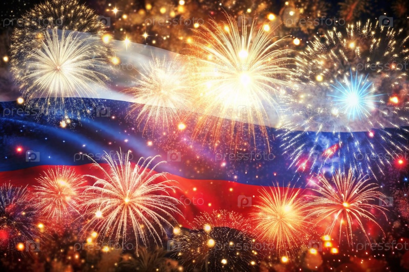 Россия. Москва. Национальный флаг Российской Федерации на фоне фейерверков. Русский триколор. День России отмечается 12 июня