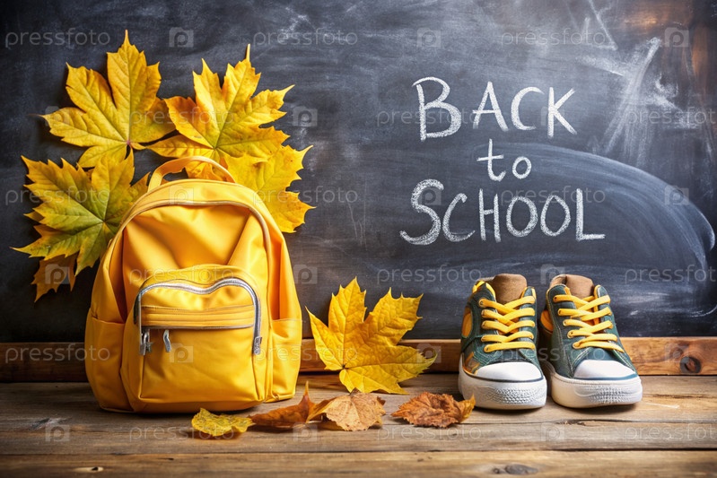 Праздник приходится на 1 сентября. Рюкзак, кроссовки и карандаши. Знак 'Возвращение в школу' на доске. Концепция нового учебного года в школе. Давайте вернемся в школу. День осенних знаний