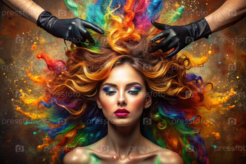 Творческий баннер для салона красоты или парикмахера. Модное профессиональное окрашивание волос. Красивая женщина с длинными многоцветными волосами. Взрыв цветов на голове