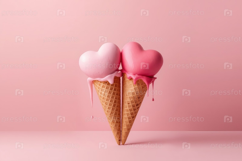 Сладкий десерт. Любовь к мороженому. Сердечно-образный конус мороженого с брызгами, сердцами и пятнами. Концепция Дня святого Валентина. Баннер, реклама