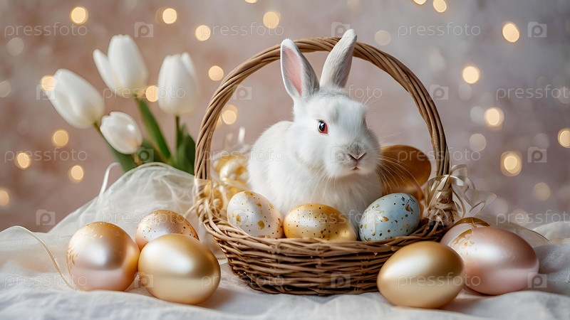 Нежные пасхальные яйца, белый кролик и нежные цветы тюльпанов на пастельном акварельном фоне с нежными венами