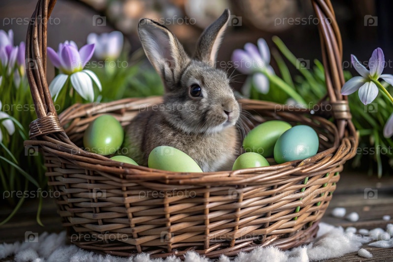 Баннер. пасхальный кролик в корзине из красочных пасхальных яиц вокруг весенних снегопадов и первичной розы. концепция праздника Пасхи
