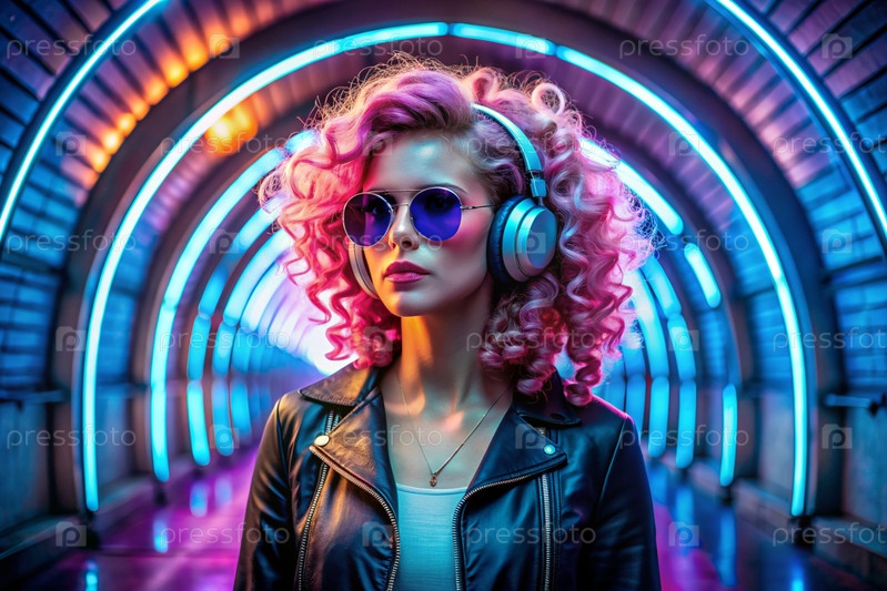 Молодая красивая девушка в солнцезащитных очках слушает музыку на больших беспроводных наушниках, стоя в неонном туннеле среди неоновых вывесок