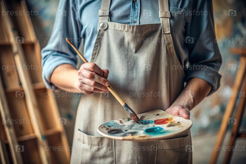 Близко. Понятие творческой деятельности. Художник в мастерской с маслом и кистью в руках. Искусство, креативность и отдых
