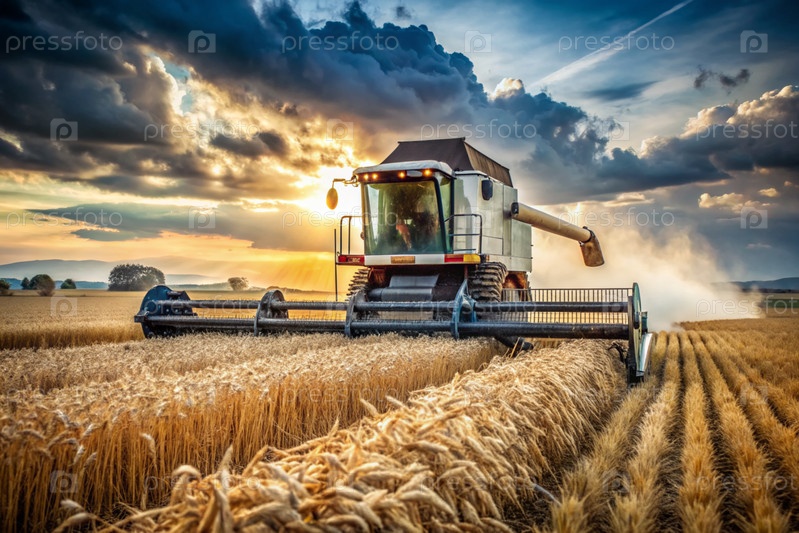 Сельскохозяйственная промышленность и машиностроение. комбинированный комбайн удаляет золотые колоски спелой пшеницы на фоне созревающего поля. Концепция посадки и сбора урожая богатый урожай