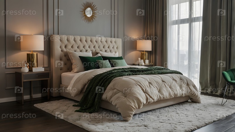 Интерьер современного дома.Минималистский уютный интерьер спальни с головкой, постельным бельем, подушками и ночным столом