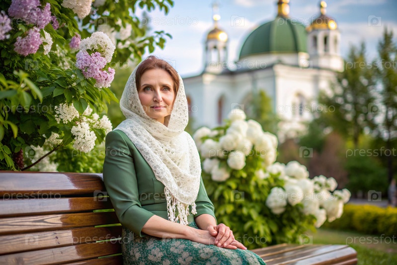 Красивая женщина в плато сидит на скамейке рядом с цветущим деревом перед православной церковью