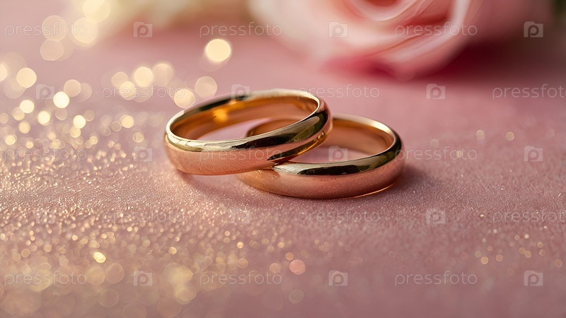 Золотые обручальные кольца на розовом фоне со стороной