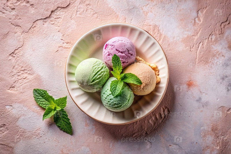 сладкий десерт. шарики мороженого с различными вкусами на бетонном розовом фоне. Всемирный день мороженого