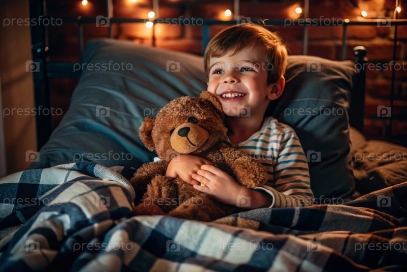 Милый мальчик обнимает плюшевого медведя, сидя в уютной кровати, маленький ребенок обнимает игрушку и готовится к постели