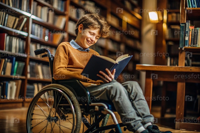 Инвалидность.Ребенок с инвалидностью в коляске читает книгу в библиотеке.Здоровье и медицина