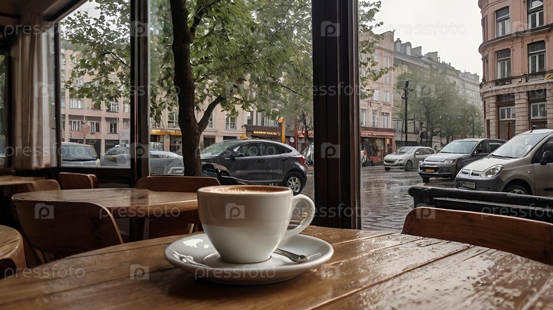 Белая чашка горячего кофе на столе в современном уютном кафе у окна. снаружи идет дождь. понятие комфорта и тепла