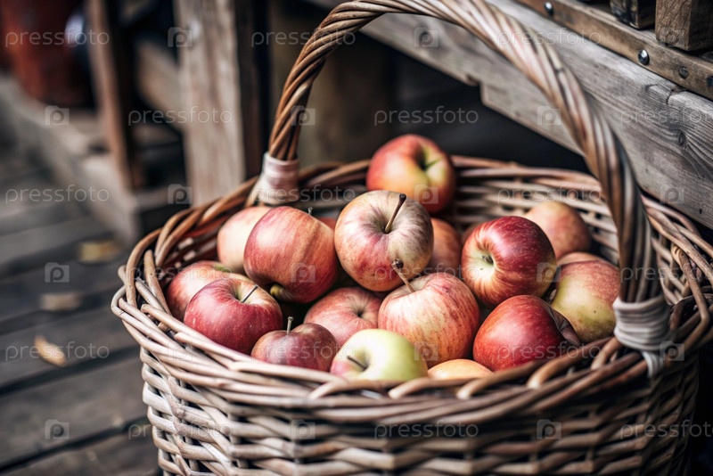 Корзина из косточки, полная свежих фруктов. корзина с красными яблоками. красивое солнечное сияние. осенний урожай, урожай или уборка