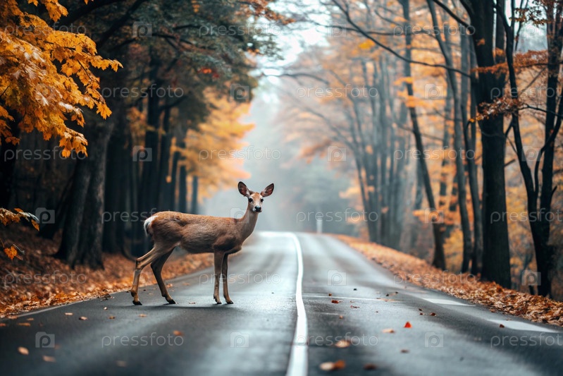 Красивый осенний пейзаж. Животное - это олень на дороге возле леса рано утром. Дорожные опасности, дикая природа
