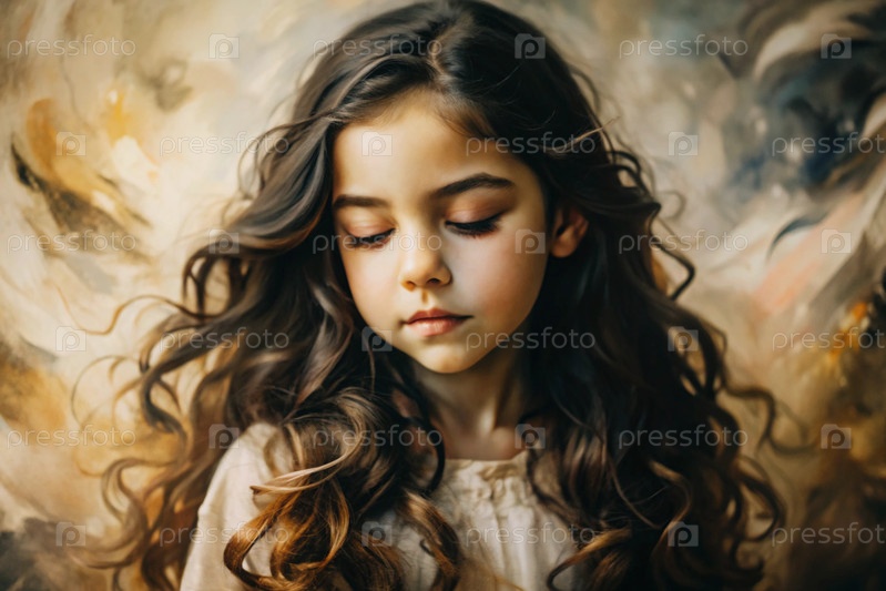 Портрет красивой маленькой брюнетки с длинными волнистыми волосами и вдумчивым взглядом.Волосы развиваются и создают ощущение легкости и естественности