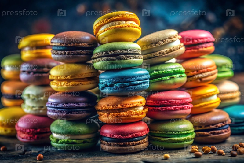 Традиционная яркая французская макароны. многоцветные пасты на темном фоне. вкусный десерт