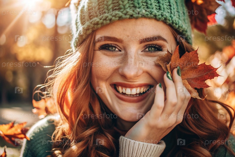 Осенний портрет. Близкий план молодой рыжеволосой женщины с ярко выраженными зелеными глазами в вязанной шляпе и свитере. Девушка смеется под лучами закатывающегося осеннего солнца