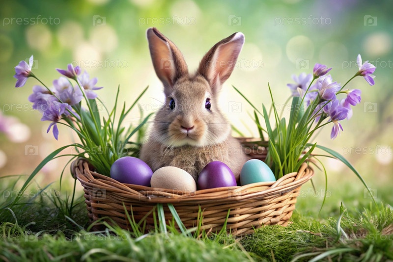 Баннер. пасхальный кролик в корзине из красочных пасхальных яиц вокруг весенних снегопадов и первичной розы. концепция праздника Пасхи