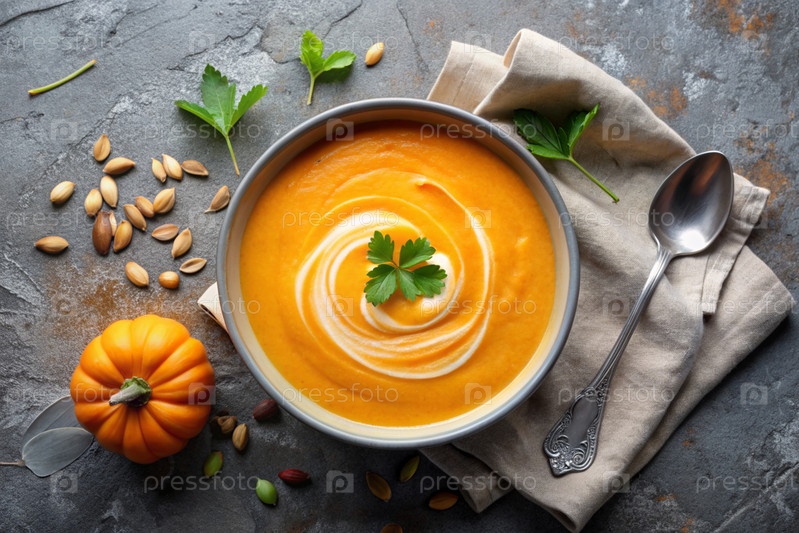 Традиционный мягкий тыквенный кремовый суп с сливками и семьями тыквы на сером бетонном фоне