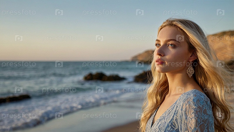 Портрет красивой женщины на пляже перед морем.Романтическая, спокойная и чувственная фотография девушки в проветренном нежном платье