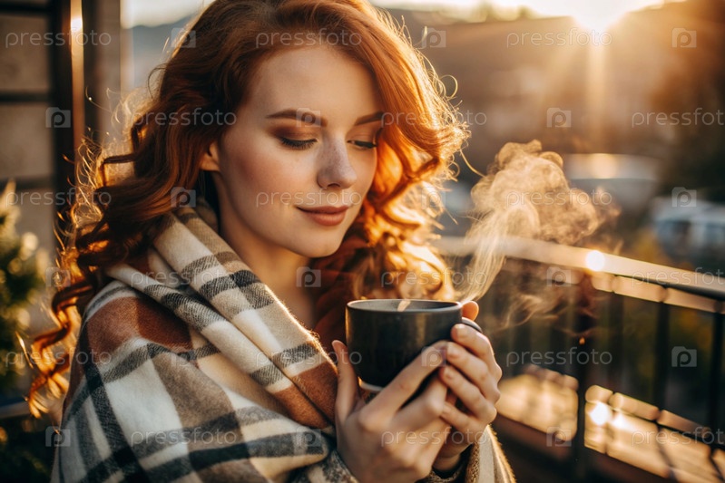 Красивая рыжеволосая женщина, завернутая в клетку с кружкой горячего кофе на красивом террасе под лучами заходящего солнца