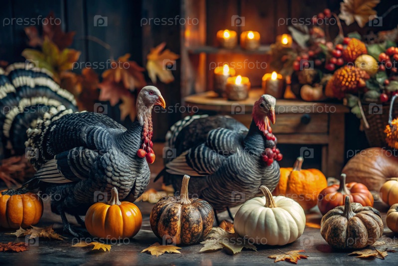 Осенний фон красочные тыквы, ягоды и домашние индейки на деревянном столе. Концепция Дня благодарения