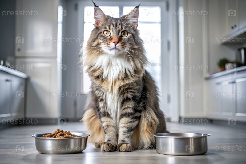 Милая кошка Майкун рядом с миской для кормления на белой кухне.Котка смотрит в камеру.Уход за животными