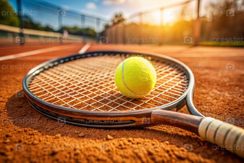На грунтовом корте есть желтый теннисный мяч и теннисная ракетка. летний вид спорта. отличный теннис