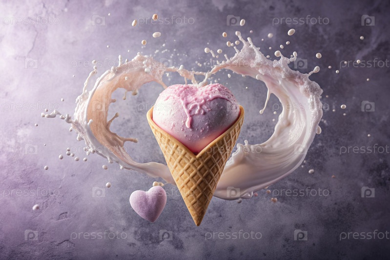 Сладкий десерт. Любовь к мороженому. Сердечно-образный конус мороженого с брызгами, сердцами и пятнами. Концепция Дня святого Валентина. Баннер, реклама