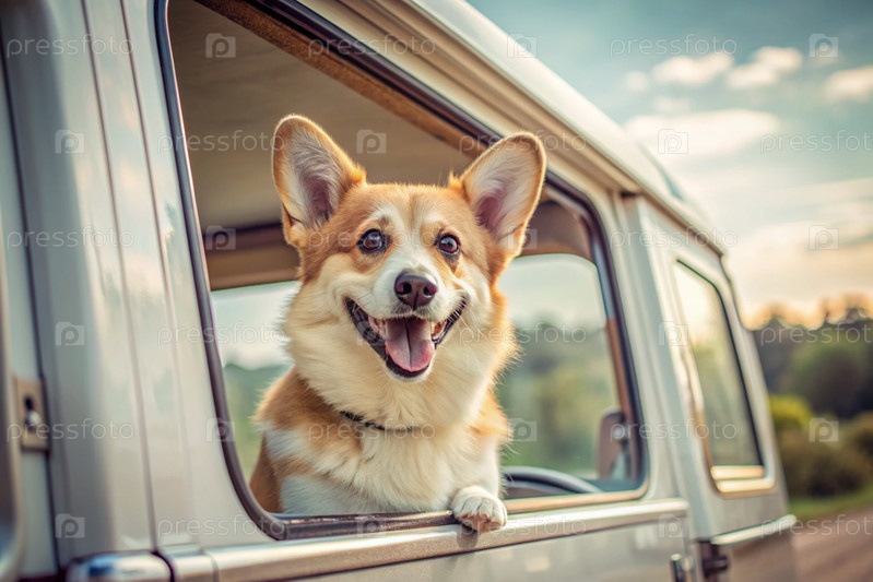 Собака выбивает голову из окна автомобиля, туристического фургона во время поездки в жаркий солнечный день