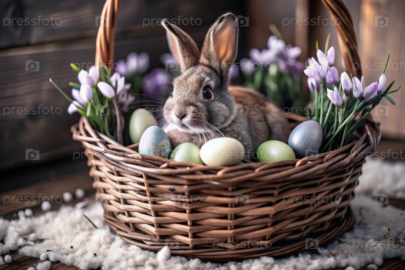 Баннер. пасхальный кролик в корзине из красочных пасхальных яиц вокруг весенних снегопадов и первичной розы. концепция праздника Пасхи
