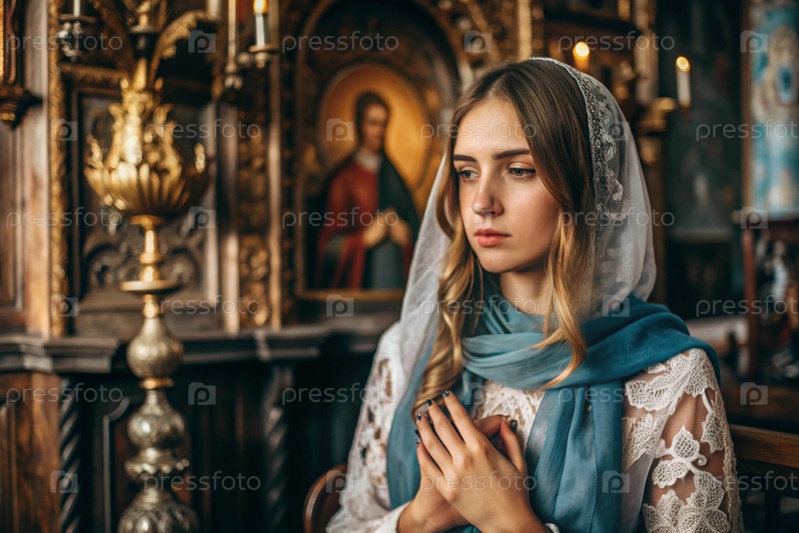 Портрет красивой молодой женщины с платками в православной церкви.Девушка молится в церкви среди икон