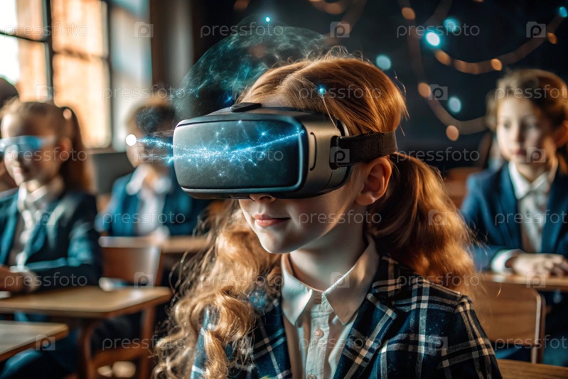 Девочка с очками виртуальной реальности. Ребенок находится в классе, а другие ученики на заднем плане. Цифровой интерфейс отображается в наушниках