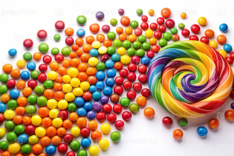Цветные конфеты в ассортименте на белом фоне. Различные сладости, кондитерские изделия и драже различных форм и цветов. Яркие тени радуги