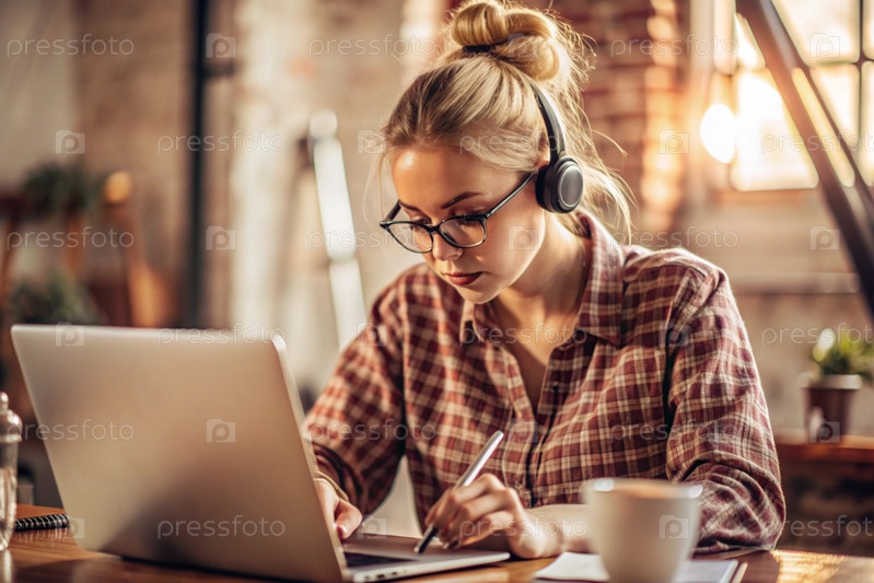 Молодая женщина фрилансер в очках и наушниках работает на ноутбуке или делает покупки в интернет-магазине