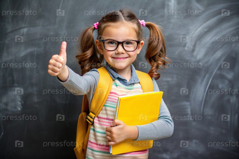 Красивая девушка в очках показывает класс своей рукой. Ребенок идет в школу впервые. Ребёнок с школьной сумкой и книгой. Ребенок в классе со доской на заднем плане. Назад в школу