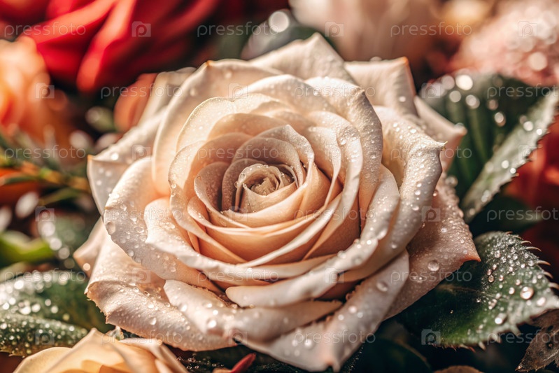 Кремовая роза красивого цвета кофе или шампанского, покрытая росой на рассвете. Красивое солнечное сияние. Фон изображения выполнен в зеленых и бежевых тонах. Естественный, экологически чистый естественный фон
