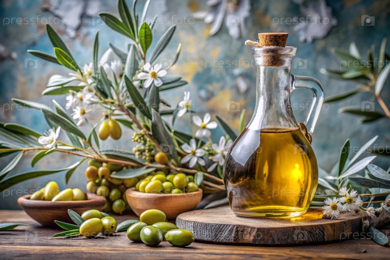 Оливковое масло в красивой бутылке со свежими маслинами и цветущими оливковыми ветвями на светлом фоне