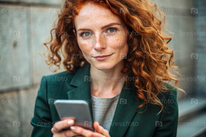 Деловая женщина с локонами красных волос и веснушками. Она одета в обычное зеленое пиджак. В руках смартфон. Небольшой бизнесмен смотрит на свой мобильный телефон