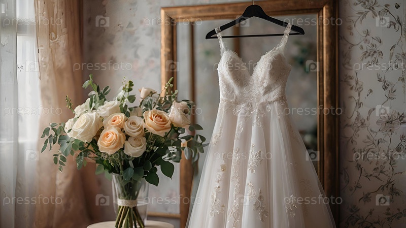 Близко. Элегантное белое свадебное платье на вешалке и букет цветов. Утро невесты. Аренда и покупка свадебных платьев для мероприятий