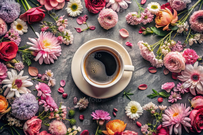 Красивая открытка. чашка кофе с тарелкой и весенними цветами. красивый натюрморт. весна, лето. доброе утро концепция
