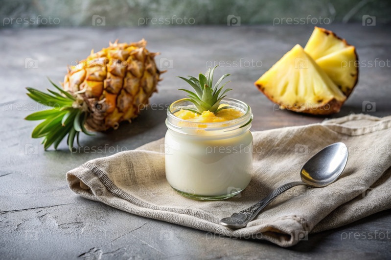 Домашний ананасовый йогурт со свежими ананами, винтажной ложкой и полотенцем на стильном сером фоне