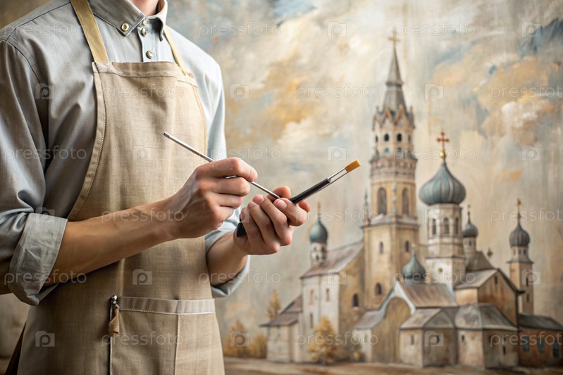 Художник рисует картину с масляными красками на холсте.На картинке изображена православная церковь, храм.Религия, творчество и отдых